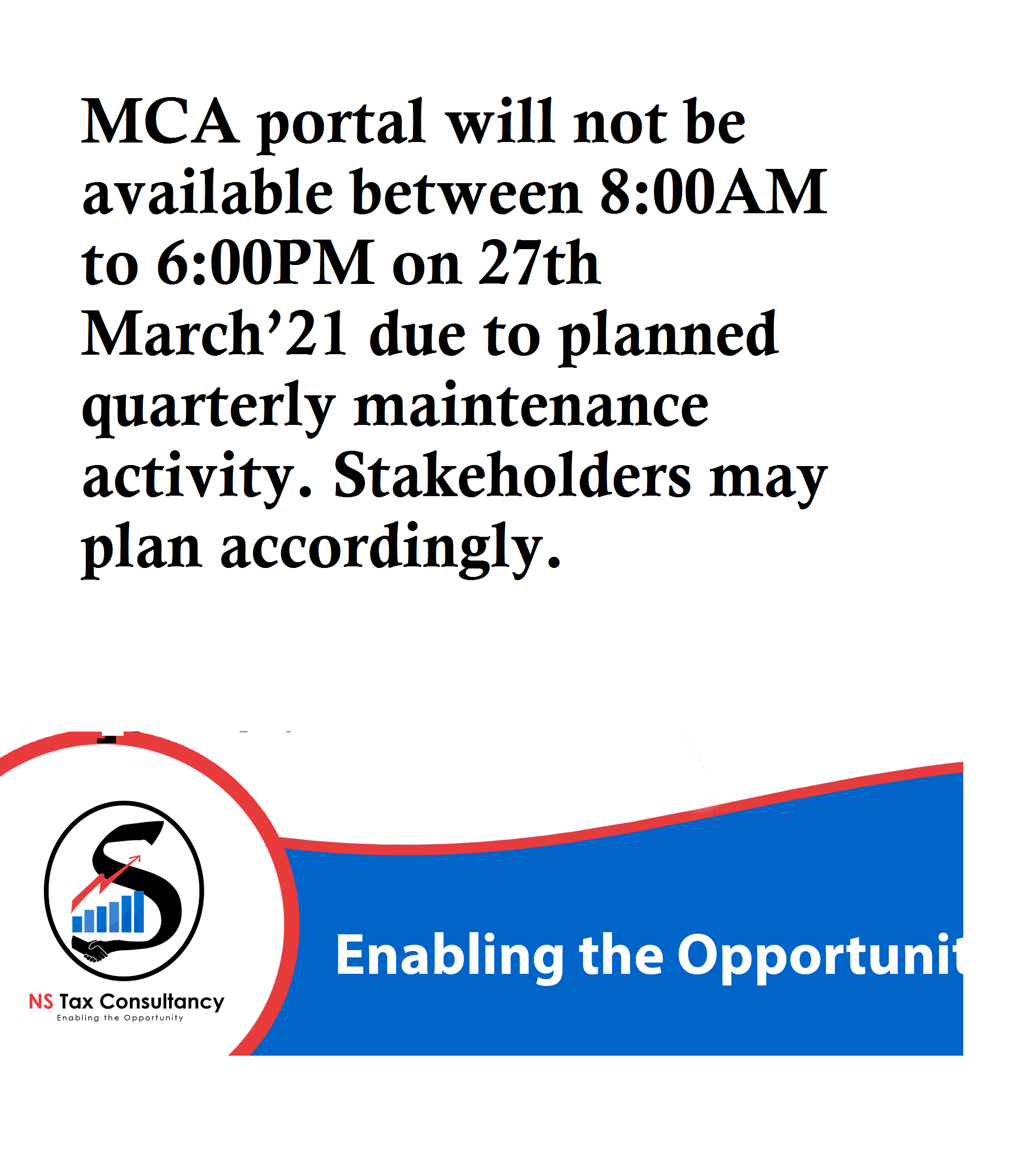 MCA portal will not be available between 8:00AM to 6:00PM on 27th March’21 due to planned quarterly maintenance activity. Stakeholders may plan accordingly.....