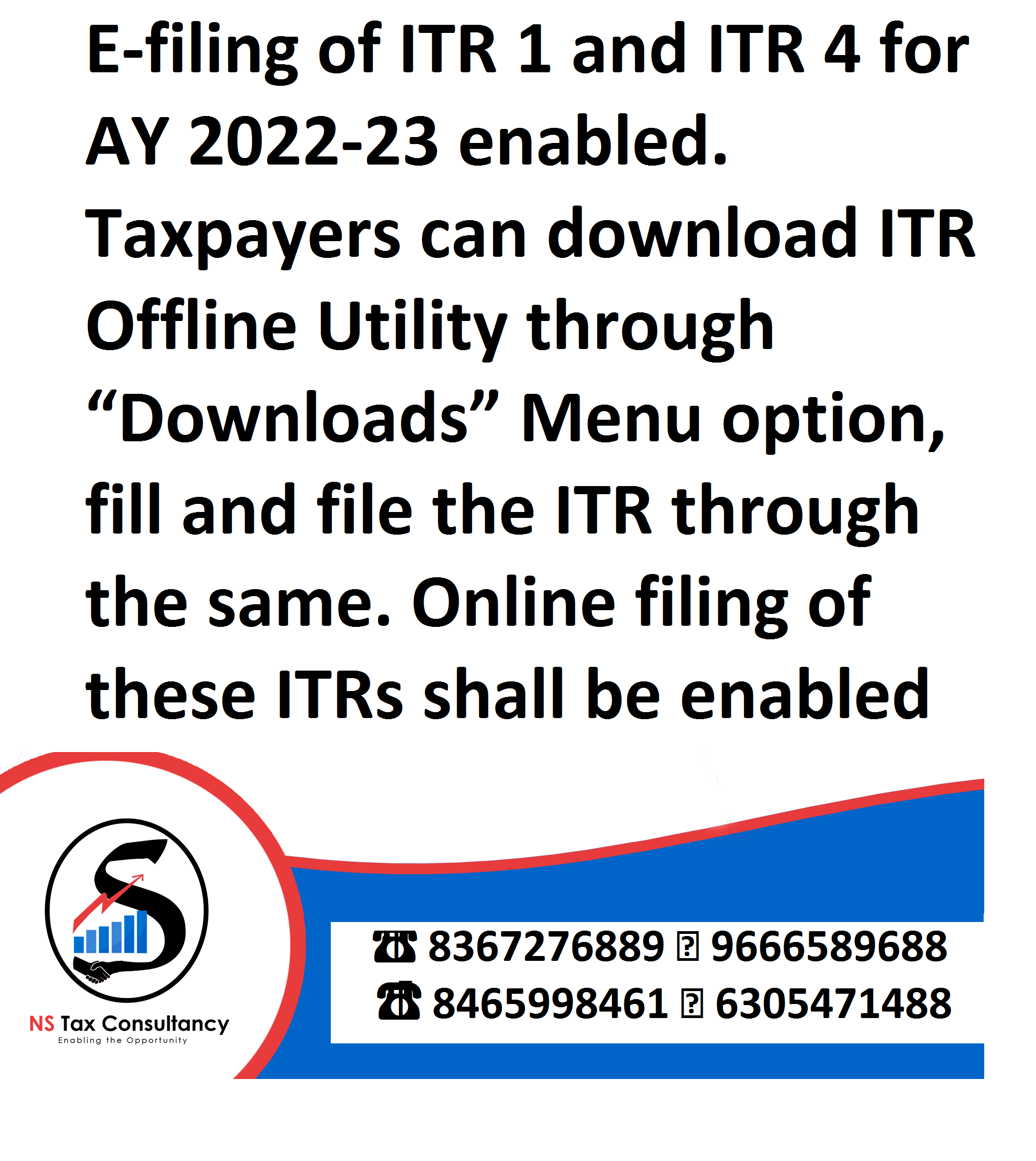 E-filing of ITR 1 and ITR 4 for AY 2022-23 enabled. Taxpayers can download ITR Offline Utility through “Downloads” Menu option, fill and file the ITR through the same. Online filing of these ITRs shall be enabled shortly.....